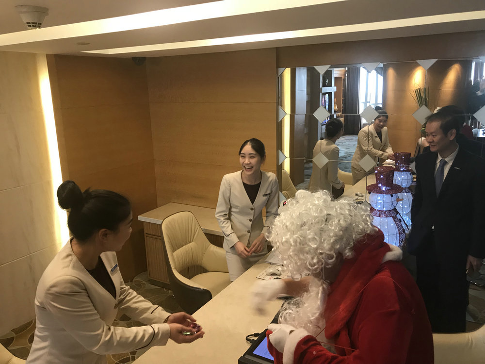 在今年这个美好的平安夜,酒店管理层特别安排了一个特别的小插曲,为了感谢每一位员工的辛勤付出,感恩与大家共同奋斗的日子,由当日行政总值秦军先生代表酒店团队前往各个工作岗位,真诚慰问当值的员工并与圣诞老人一同送上小小的礼物。正是全体干职员工的辛勤付出,才铸造了深圳深航国际酒店的不断成长进步和骄人的业绩和口碑,预计2017年全年营业收入将再创历史新高。