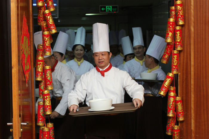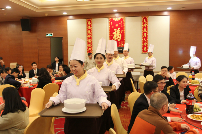 伴着主持人高喊“上汤圆了”,酒店管理层端着热腾腾的汤圆登场了