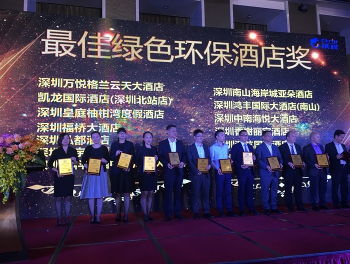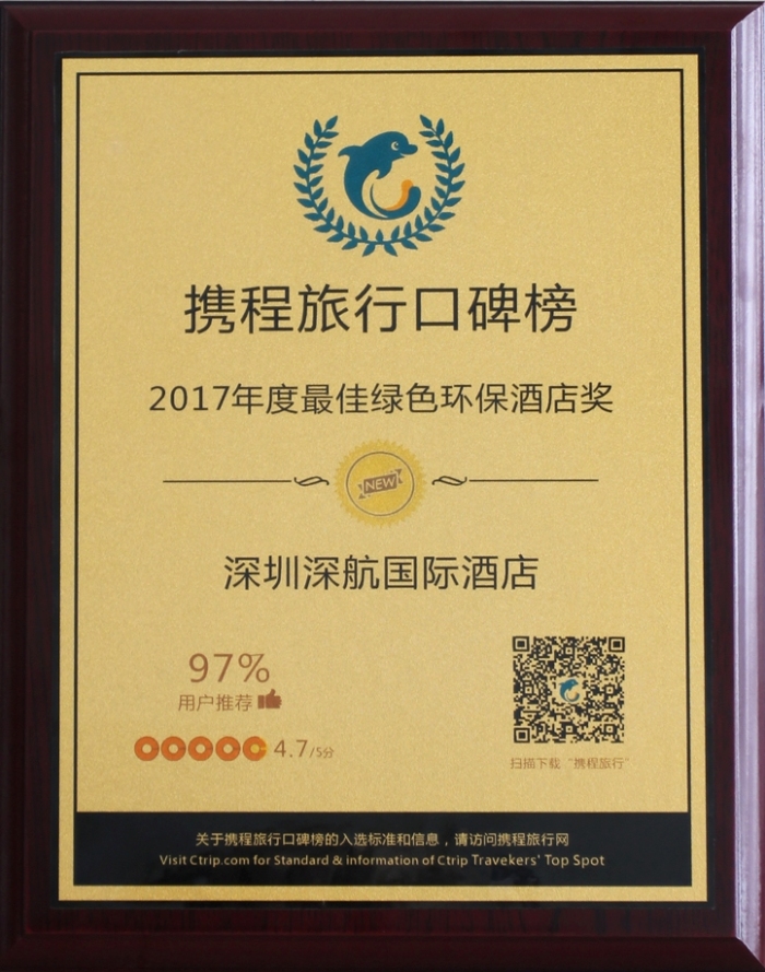 近日,在携程年度酒店颁奖典礼上,深圳深航国际酒店凭借优秀的酒店服务水平及多年来在绿色、节能管理方面取得的成就,喜获携程旅行口碑榜“2017年度最佳绿色环保酒店奖”。