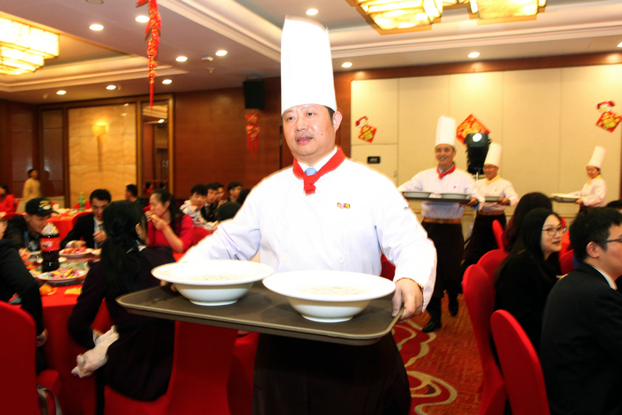 随着主持人高喊“上饺子了”,酒店管理层端着热腾腾的水饺登场了