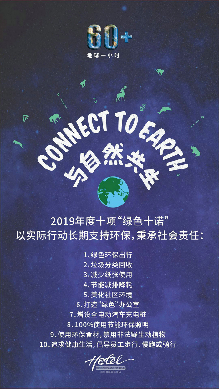 “地球一小时”是世界自然基金会应对全球气候变化所提出的一项倡议,希望个人、社区、企业和政府在特定的时间(20:30 - 21:30)熄灯一小时,来表明他们对减少碳排放和节省能源的支持。深圳深航国际酒店作为一家有社会责任感的五星级绿色酒店,一直致力于节能环保工作,继续贯彻绿色十诺。