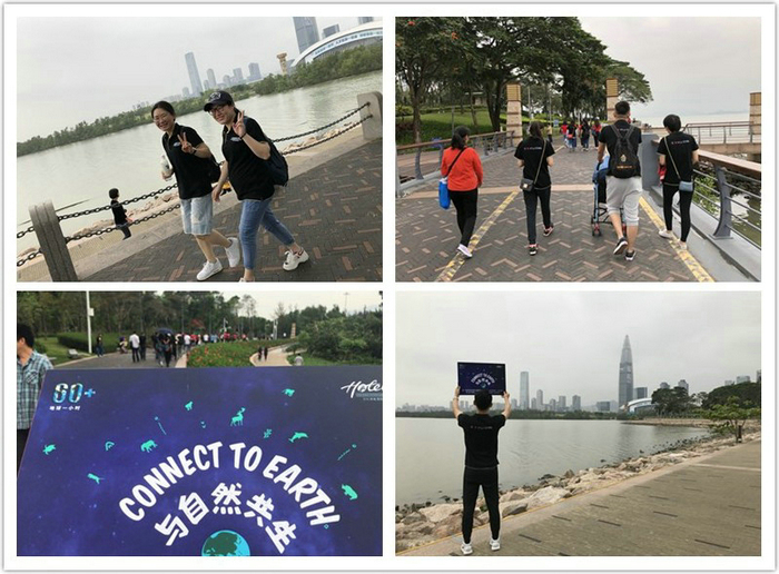 与此同时,早上10点,由酒店人力资源部组织的员工健康绿色徒步活动在深圳湾公园进行得如火如荼,酒店干职员工及其家属趁着美好的周六时光,约30位员工兴致盎然地参加了此次活动,不但以实际行动积极支持酒店参加全球性环保活动,员工们更在活动中锻炼了身体促进了感情,欢声笑语伴随全程。而在晚上20点30分至21点30分熄灯一小时期间,在酒店员工前海湾宿舍区楼下,约20位员工准时唱响60+迷你KTV,为这个环保之夜拉上完美的帷幕。