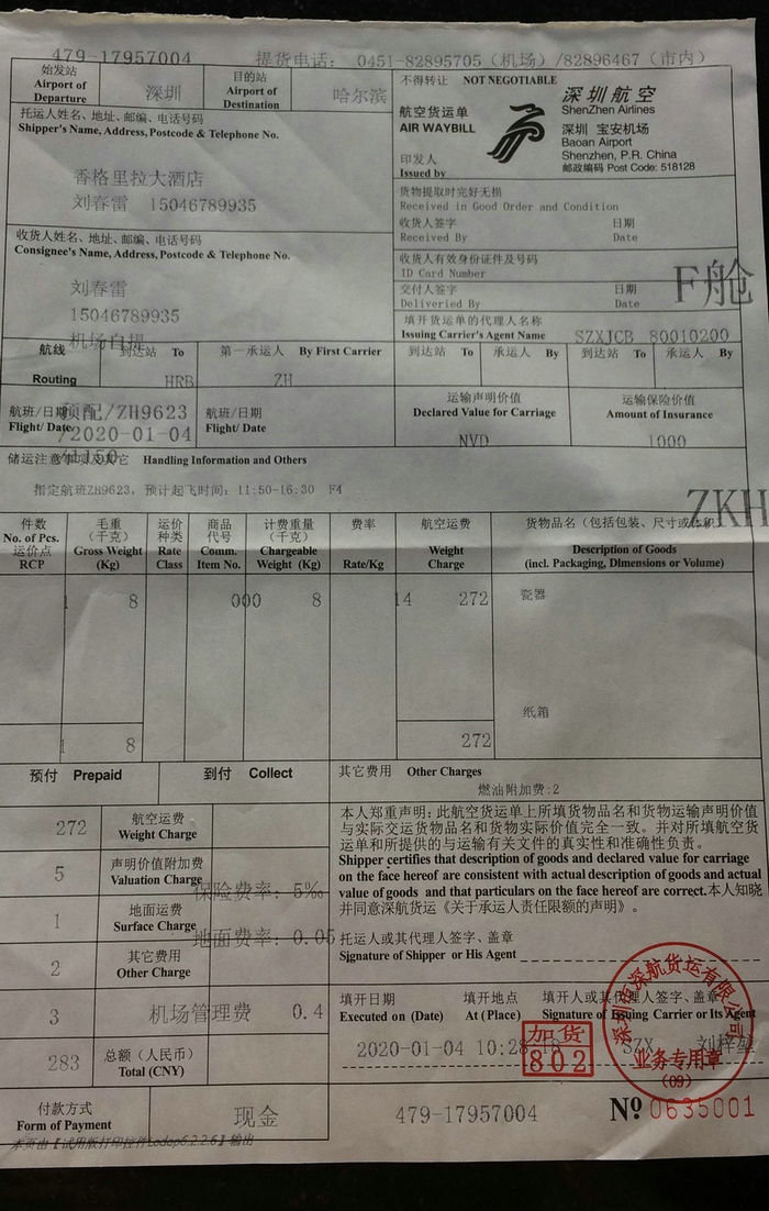 佛山金钥匙贾聪得知这个消息,马上与深圳金钥匙梁自超进行了对接,并迅速安排将打包好的陶瓷于1月4日上午准时送达了深圳机场;而梁自超也马不停蹄地对陶瓷航空托运手续以及相关易碎提醒进行反复的确认。最终, “丰收如意”陶瓷平安无误地登上飞机,并于1月4日11:50分开始了它“鼠生”第一次前往哈尔滨的飞行, 至此大家才稍稍松了一口气。接着,梁自超又将班机预计抵达时间、联系方式逐一提供给了哈尔滨的金钥匙刘春雷, 以确保货品递送过程中的万无一失。