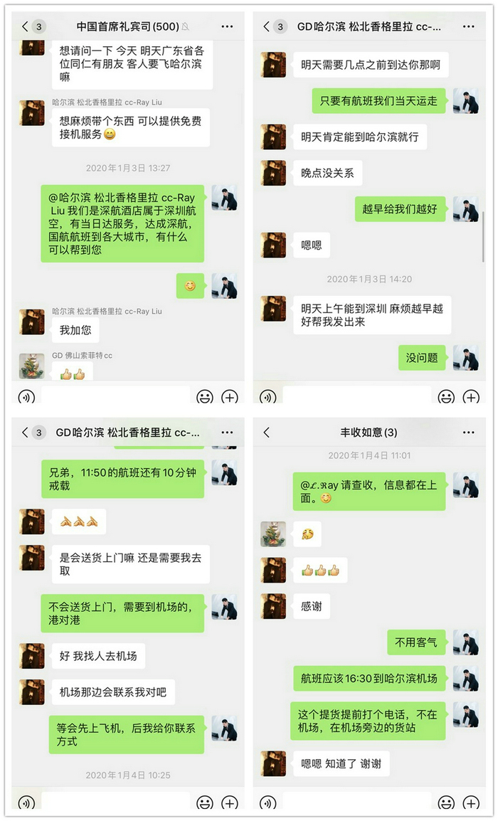 与此同时,另一个更为艰巨的任务摆在了大家面前:如何把陶瓷制品“丰收如意”及时地从位于南方的广东佛山运到三千多公里之外的东北哈尔滨?此时已经是1月3日下午,各地金钥匙纷纷出谋划策,但却没有一个相对保险的万全之策,正当哈香金钥匙刘春雷毫无头绪时,深圳深航国际酒店金钥匙梁自超主动联系上了他,并表示深圳航空新近推出的超快送“当日达”业务能在全国范围内6小时直达, 应该可以助一臂之力。正巧1月4日就有深航航班飞往哈尔滨, 他会协助联系深航货运将陶瓷按时运到哈尔滨。