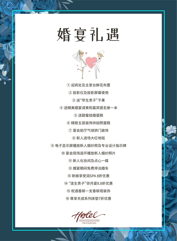 若需了解更多婚宴优惠详情,敬请致电深圳深航国际酒店市场营销部(86 755) 88819999转6811。