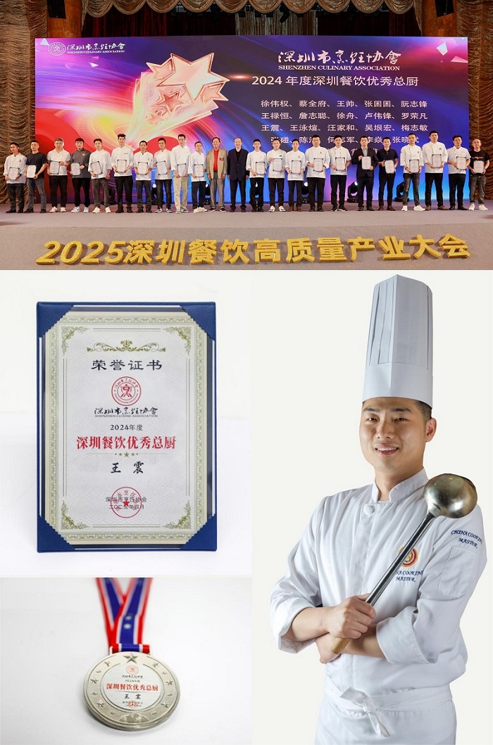 在由深圳市烹饪协会主办的深圳餐饮高质量产业大会上,深圳深航国际酒店中厨房王震凭借其卓越的专业技艺,荣获“深圳餐饮优秀总厨”称号。