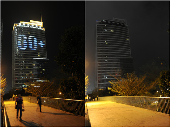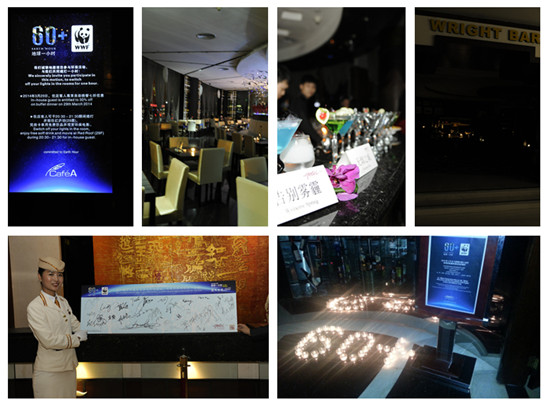 为了确保此次关灯活动做到有条不紊、万无一失,同时获得来自客人和员工的理解和支持,酒店管理层精心组织策划,提前做了充分的准备。首先,在客房内摆放了客信邀请住客共同参与顶层红庐坊的“环保电影之夜”活动,活动提供了特色鸡尾酒、软饮及小食供客人免费享用。并在大堂液晶显示屏及客房电视点播系统中播放“地球一小时”宣传片进行预热。提前三个晚上在户外灯光不断轮播的“地球一小时”宣传创意图片,也吸引了众多路人的目光及拍照;其次,为了使环保工作更加深入人心,酒店向宾客及员工提前发出了活动倡议书并设置了签名板,得到了宾客和员工们积极的响应。目前,酒店官方新浪微博及官方微信“环保先锋”有奖分享活动也进行得如火如荼。