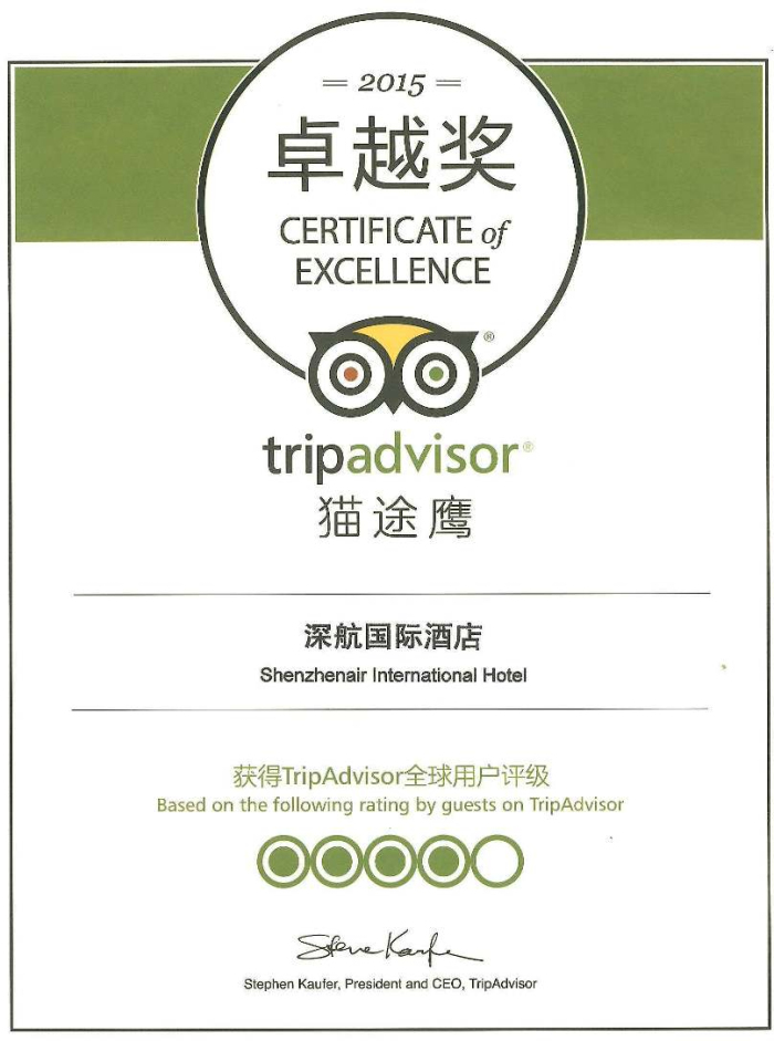 深圳深航国际酒店荣膺TripAdvisor“2015年度卓越奖”殊荣