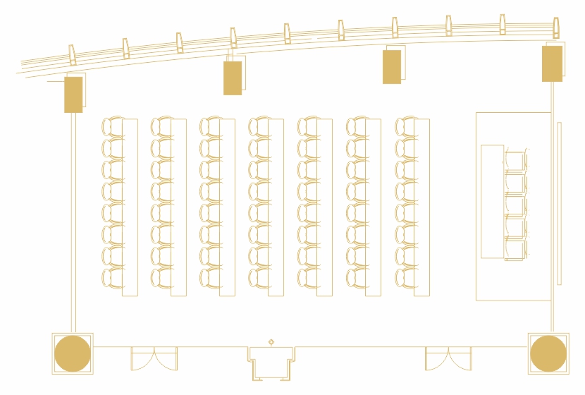 课桌室可摆42人,U型30人,鱼骨型36-48人,剧院式70人。