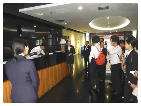 一行人通过漂亮的红廊来到公寓前台,前台主管VICKY已经在此等候,她与南宁同事详细地介绍本公寓前台的业务。