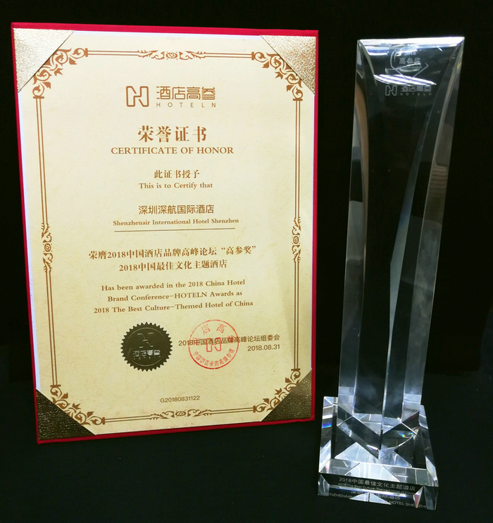 2018年8月31日,在上海举行的“2018中国酒店品牌高峰论坛暨第五届酒店高参锋会”上,深圳深航国际酒店凭借鲜明的航空文化主题特色、良好的在线网评口碑及卓越的创新服务品质,荣膺“高参奖·2018中国最佳文化主题酒店”殊荣。