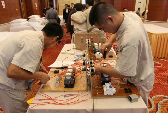 工程部选手争分夺秒进行电机星三角启动线路连接比赛项目