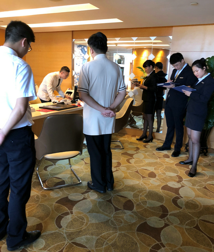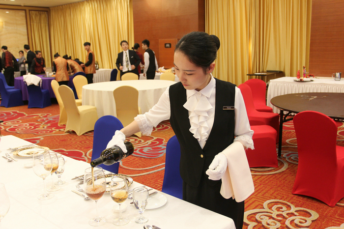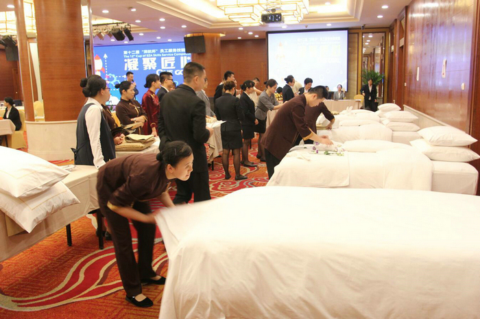 房务部项目丰富多彩,从服务大使参观客房服务、接待员办理入住手续流程、叫醒服务、中式铺床夜床摆设、水上救援、折叠客衣浴袍到最后的礼宾车队平行入库等项目;工程部空调维修、油漆调色等则处处彰显参赛选手的最高技能与最佳状态。