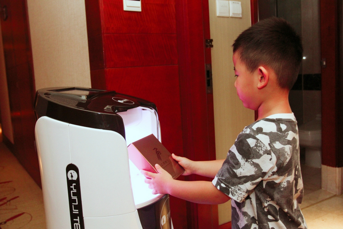 “鹏鹏”可盛放最重达10kg的货物,平常主要递送物品有毛巾、矿泉水、酒水、充电器、儿童牛奶、儿童礼品等,以及其他一些顾客需要的且“鹏鹏”能递送的物品,如剪刀、指甲刀、拖鞋。