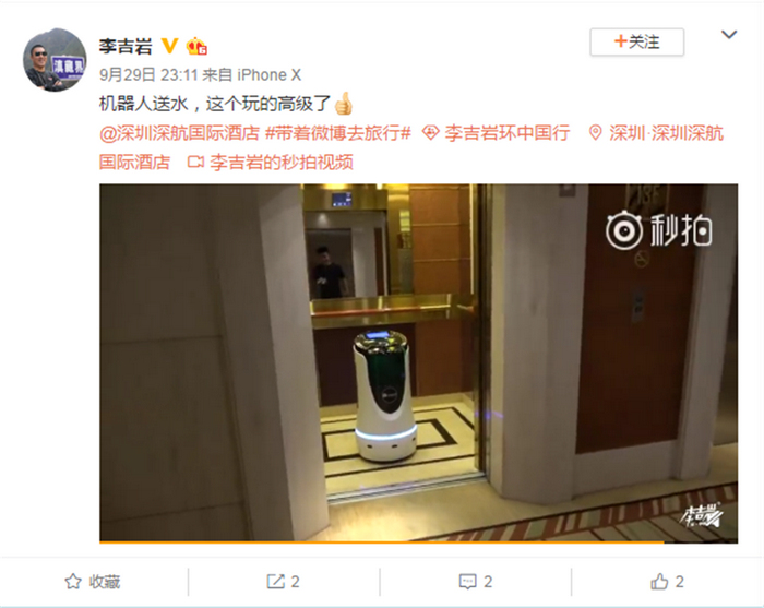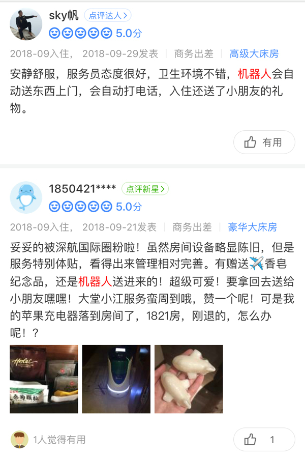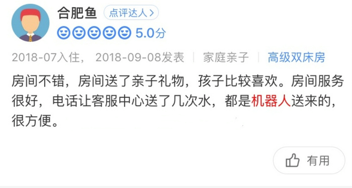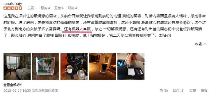 “鹏鹏”在9月份递送物品总计1142次,平均每天递送物品近40次左右。自2018年截止至9月30日,“鹏鹏”已经服务了9869次,总共获得151次实名点赞。24小时全年无休的“鹏鹏”,绝度是酒店的劳模~~~