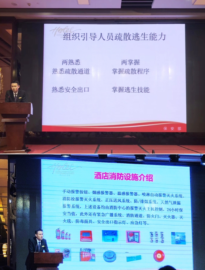 此次培训会内容生动实用,深圳酒店和哈尔滨酒店火灾案例分析透彻,酒店具备安全消防意识极为重要,提前了解安全出口路线、消防设备储放位置和掌握正确自救方式是逃生的基本原则。继本次消防知识培训后,防城港深航国际酒店还将继续进行消防灭火演练和紧急疏散演练,提高消防灭火的实际操作能力,进一步增强全体酒店员工的安全防范意识,杜绝危险源头发生,并将秉承深航优良管理文化,让每一位宾客入住得安心、放心。