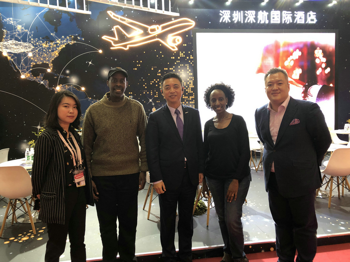 展会期间,乌干达驻广州总领事馆总领事索罗曼•鲁提嘉Solomom Rutega 莅临深圳深航国际酒店展位,同时对酒店浓郁的航空特色展装表示出浓厚兴趣,并饶有兴致地在主背景画面的世界地图上找寻家乡非洲的位置座标。
