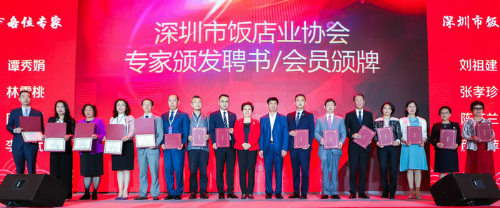 2019年恰逢深圳市饭店业协会成立15周年,在当晚举行的十五周年庆典仪式上。深圳市饭店业协会张振山会长说道:在新时代新机遇新使命面前,我们定会一如既往地与会员企业同道,并为行业提供更多支持性、资源性的服务,继续秉持“搭平台、组资源、推共享、促发展”的服务理念,共促深圳饭店业的高质量发展。随后,由深圳市饭店业协会隆重授予深圳深航国际酒店黄俭总经理、魏文斌常务副总经理、肖强副总经理作为深圳市饭店业发展研究院特聘专家,为深圳市饭店业协会的壮大发展继续出谋划策添砖加瓦!