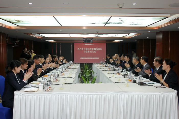 2019年8月26日,柳州深航鹏逸酒店总经理罗旭东先生率领管理团队共14人抵达深圳深航国际酒店,并进行两天一夜的参观交流,深圳深航国际酒店常务副总经理魏文斌先生、副总经理肖强先生携酒店管理团队热情地接待了柳州深航鹏逸酒店的领导和同仁。