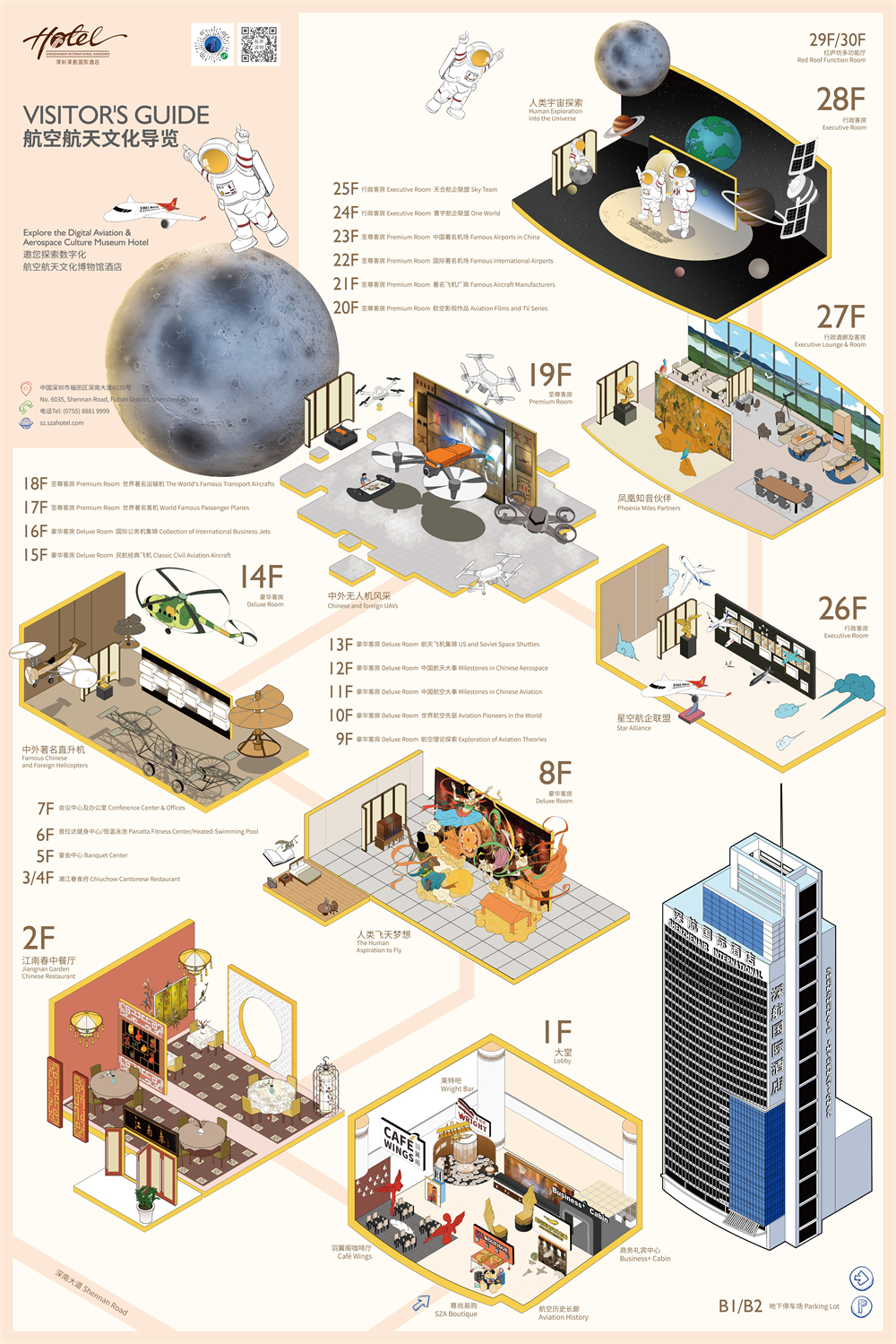 深圳深航国际酒店持续打造产品差异化以形成独特的竞争优势,开创了“博物馆+酒店”的先河。重点围绕“楼层公区、客房内部”两个区域营造“空·天”展馆来烘托航空航天文化氛围,力求使宾客进入酒店就仿佛开启一场妙趣横生的博物馆打卡之旅。酒店在424间客房融入了全新文创设计理念,通过声、光、电等多种现代技术手段以及丰富的艺术装饰、雕塑摆件、主题挂画、导览投影、炫酷冰屏等点缀方式给住客在千篇一律的旅行中增添了别具一格的乐趣。