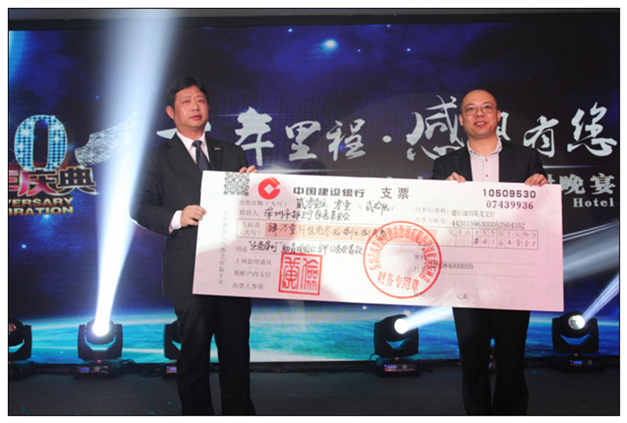 深圳深航国际酒店员工们以近乎专业级别的演出引得阵阵喝彩,微信摇一摇有奖互动环节竞争激烈。晚宴现场举行“点亮心灯”助盲慈善捐赠仪式,酒店常务副总经理魏文斌先生将爱心支票递交至红马甲负责人红羽先生,通过为期一个月的义卖活动,宾客、员工们自发筹得爱心款项人民币41638.8元,善款全额捐赠「红马甲公益基金」,切实帮助在深圳生活的视力障碍人士能够更好地生活及工作,点滴善举,汇聚成源源不断的爱心力量。