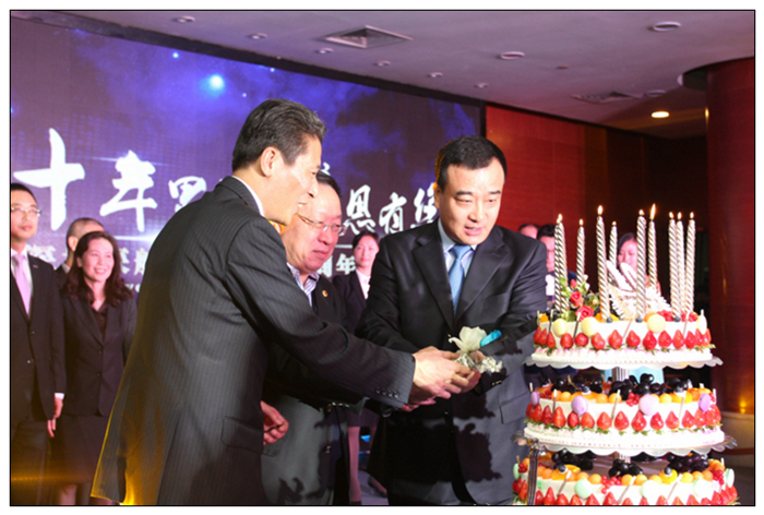 深航王杰副总裁、酒店黄俭总经理及宾客共同切蛋糕庆贺酒店十周年生日