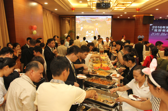 活动分为“品美食、玩游戏、赢大奖”三大部分。餐饮部提前为大家精心准备了卤鸡翅、烤肉串、风味QQ肠、月饼等多款精致美味小吃及各式水果、饮品。大家难得离开了忙碌的工作岗位,开心地玩着游戏,品尝美食,尽情享受大家庭的快乐。