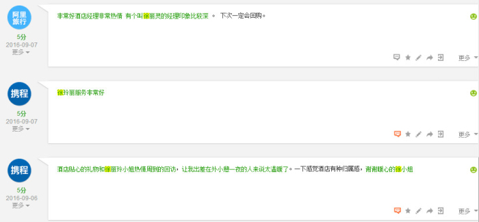 如今回首,徐丽玲十个月的工作生涯,工作日渐上手熟悉,稳稳地一步步成长,就如她说:这里有熟悉的同学、有温暖的同事、有喜爱的工作、有支持的家人,还有无数鼓励自己的客人,这是一份美好而值得期待的工作。而她的真诚付出,也在金秋九月,收获了整整10个满分的5分点评,赞赞!
