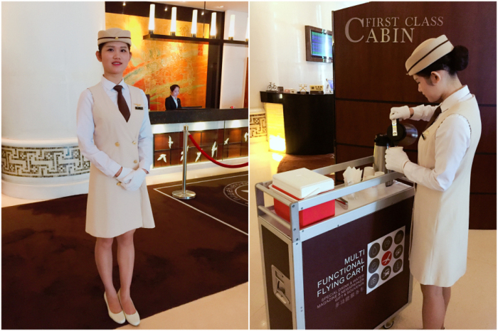 上文图中出现的“多功能服务车”,目前配备有中英文报纸、杂志、冷热毛巾、饮品等。目前每天以下这7个时段:08:30 / 10:50 / 13:50 / 16:20 / 18:00 / 20:00 / 22:00 它的身影都会出现在大堂中,由宾客服务大使为您传递一份贴心的服务。