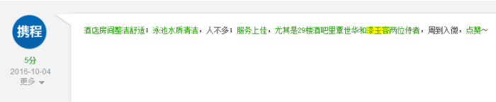 记得国庆期间,一家来深圳游玩的客人,在夜间来到了红庐坊喝上一杯放松身心,正巧当晚我当班,交谈中得知客人一家大小是来深圳游玩的,便很自然地向他们介绍了酒店的餐饮推广、穿梭巴士服务、深圳热门景点等等,客人表示很感谢,听说后来还在网络上点名表扬了,对我真是大大的鼓励及认同!
