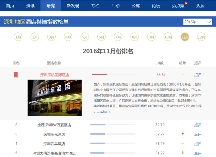 在即将过去的2016年, 据迈点网深圳地区酒店舆情指数榜单数据显示,深圳深航国际酒店自2016年6月至11月已连续6个月蝉联第一;截至12月7日,携程网深圳五星酒店客户满意度排名列第二(4.7分); 慧评网国内外18家主流OTA综合评价得分为94.3分,在周边同档次酒店中总体评价全年始终排在第一。 除此之外,深圳深航国际酒店凭借“任何时候,自然体贴”的优质服务还获得了越来越多来自海外宾客的高度赞赏,连续五年获得TripAdvisor猫途鹰卓越奖。