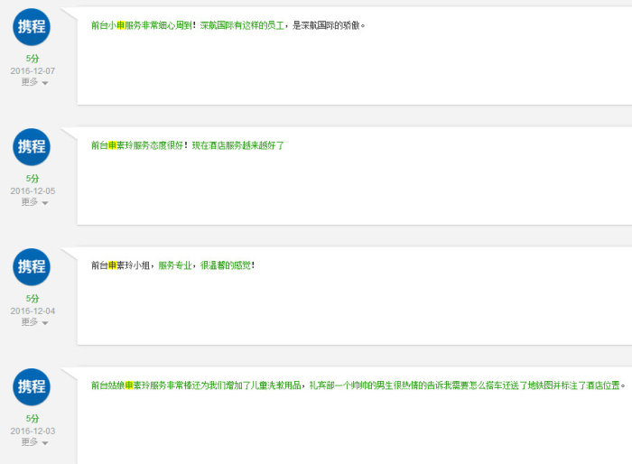 全心全意为顾客服务,是服务行业的一句老话。不断超越客人的期望,为客人制造惊喜,才能赢得宾客的满意。申素玲就是这样,她诚心服务,微笑待人,细心接待,用心工作,始终保持着积极向上的精神风貌,同时也取得了许许多多客户的好评。深圳深航国际酒店就是因为有许许多多像申素玲这样的优秀员工,日夜工作在平凡的岗位上,把微笑和满意留给顾客,良好的团队氛围,在工作中你追我赶,成就了酒店的良好品牌。也最终以令深圳深航国际酒店,在携程网2016年年度深圳五星级客户满意度排名第4名(4.7分),全年65个满分日。在泰国曼谷举行的2016亚洲旅游年度风尚大典上,深圳深航国际酒店凭借良好的在线网评口碑及卓越的创新服务品质,喜获“亚洲最佳商务酒店”殊荣。