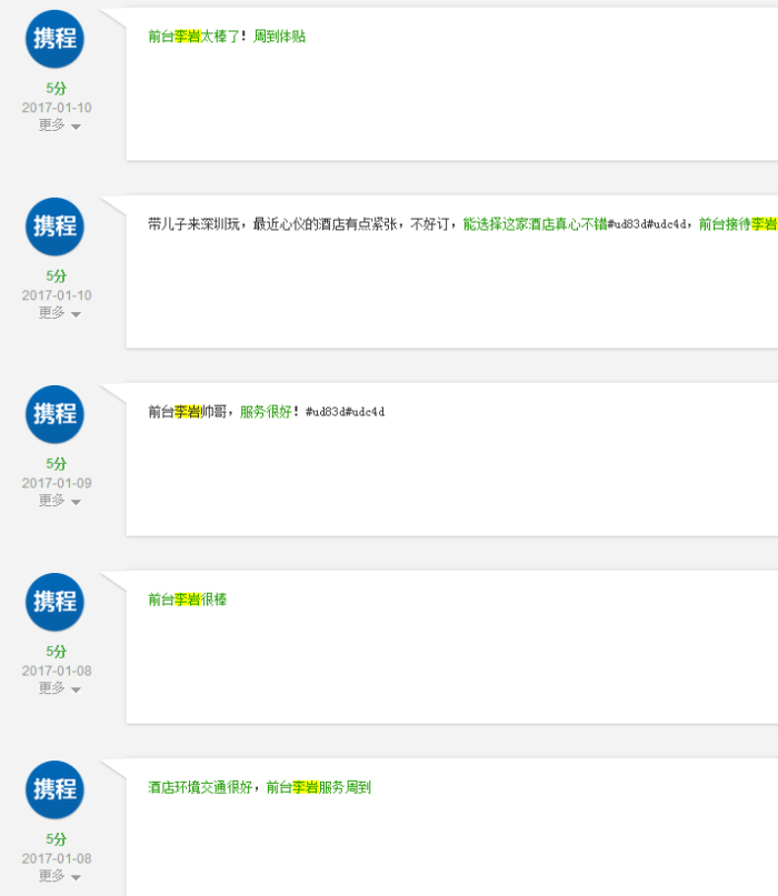 在刚刚过去的2016,是充实忙碌而又快乐的一年!2015年5月28日,我入职深圳深航国际酒店礼宾部,机缘巧合下,2016年转职到客务部,回首来时的路,在这9个月里,在部门领导及同事们帮助下,从对于酒店前台接待工作一无所知到现在能够独立当班,从不敢主动开口到现在能够与客人对答如流并提供优质服务,我很庆幸做到了,并一直坚守岗位,细致认真地服务好每一位客人。踏实工作,勤勤恳恳,一月份得到了这么多客人的满分点评,是对我最好的鼓励,也是对我工作最大的认可!