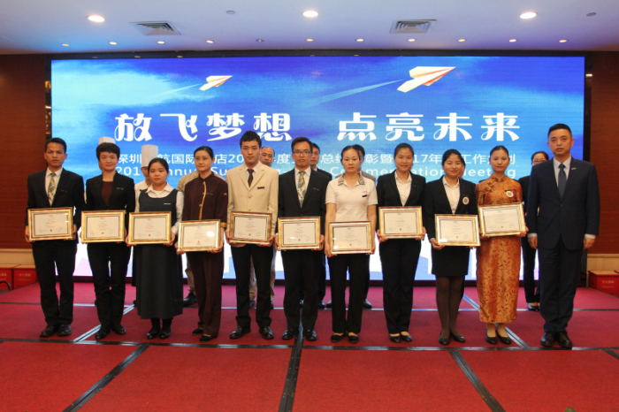 深圳深航国际酒店副总经理肖强先生(右一)向“年度优秀员工”颁发奖状