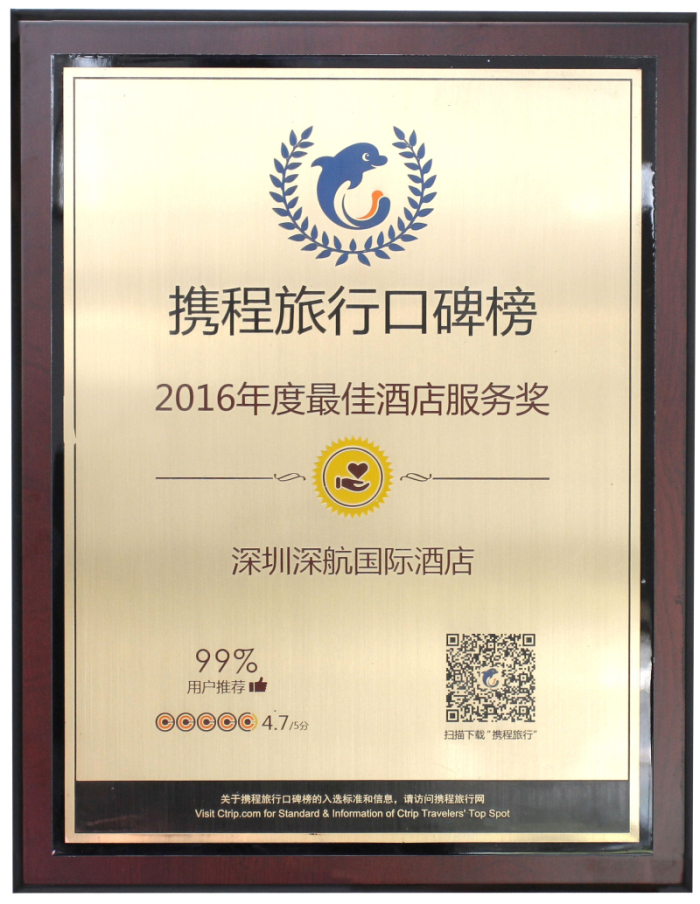 近日,深圳深航国际酒店以高达99%的用户推荐率、4.7分的高分(总分5分)以及千名宾客的评价吸引了众多旅游消费者和网友关注和投票,获评携程旅行口碑榜“2016年度最佳酒店服务奖”。携程旅行网是国内领先的知名综合性旅游服务公司,携程旅行口碑榜是基于其2.5亿用户的出行数据以及攻略社区1.4亿用户的真实点评和分享,涵盖了最佳目的地、酒店、景点、航空、旅游、邮轮等6大类别榜单,覆盖游客全方位旅行体验,是业内较全面、权威、可靠的旅游指导攻略。榜单本身亦被认为是携程用户乃至整个旅游行业的重要评价标杆之一。