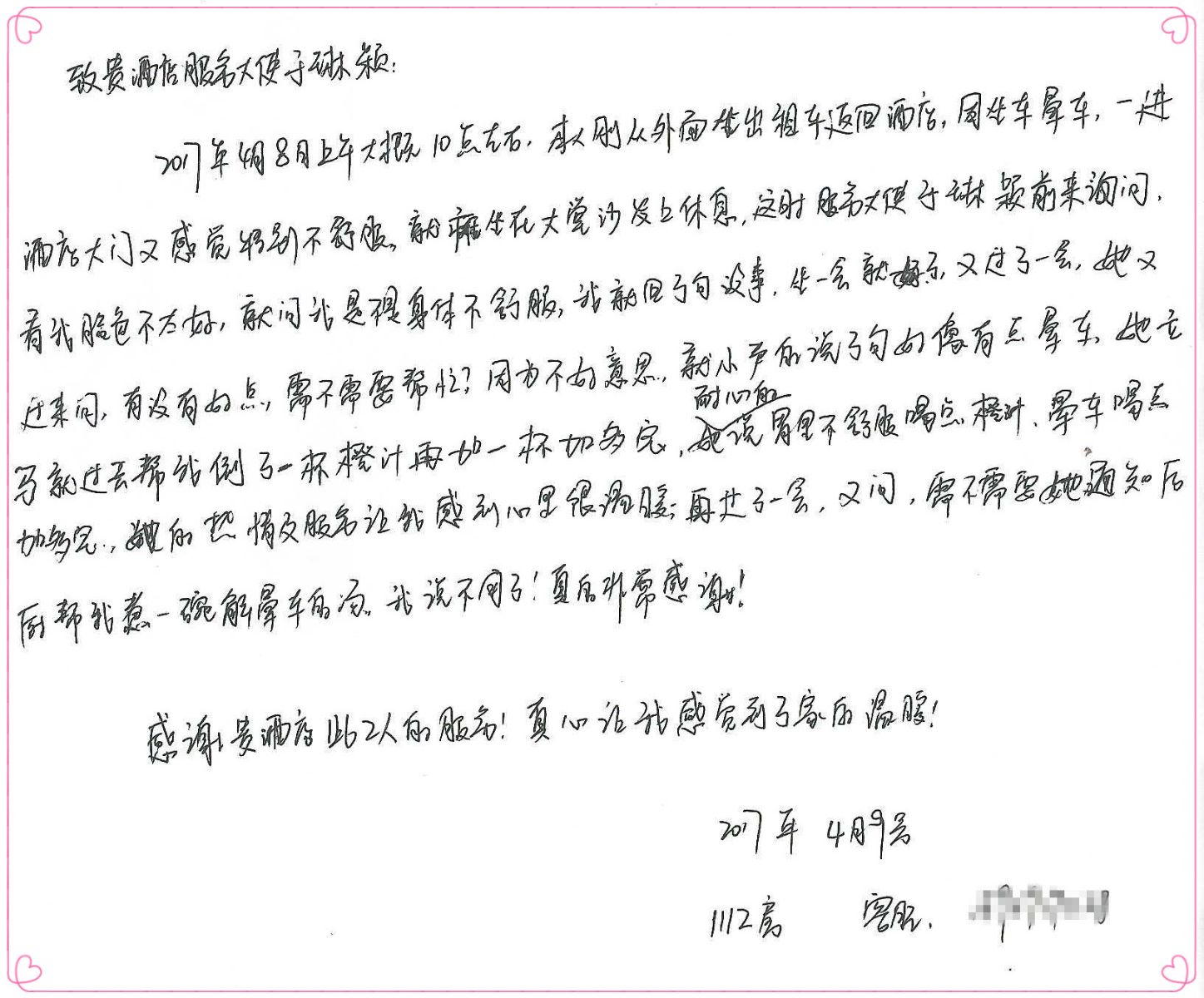 这一天当班,一位女士抵达酒店大堂坐在休息区,我看她神色略显疲惫,便赶紧上前仔细询问,经过一番了解,得知她原来是晕车了,于是我便格外留意起她并主动为她端来饮品,并仔细询问是否还需要解晕车的汤。其实,当时也是尽自己的绵薄之力,希望让她不再那么难受。而令我意外而感动的是,在第二天,居然收到了一份来自她的书面感谢信,其实我真的觉得自己只是做了件微不足道的小事,而没想到的是自己的举动也无形中感染了宾客。其实,在这份工作中最让我开心的事就是别人因为我的服务而感到开心和幸福,而这也让我对这份职业充满了满足感和憧憬。
