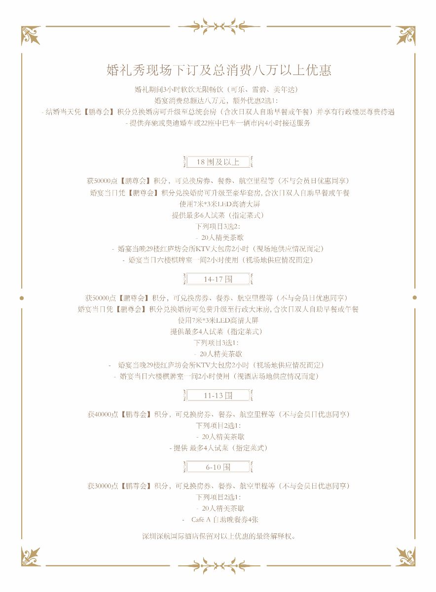 即将步入婚礼殿堂的新人们不可错过此次机会,除了下订幸运抽奖,现场签约预定酒席的新人可获得多重超值优惠!现场下订,消费总金额达八万元,当日婚房可升级至总统套房或享受奔驰接新人服务、等。预订婚宴消费包含试菜、红庐坊KTV包厢、迎宾茶歇等实用服务。