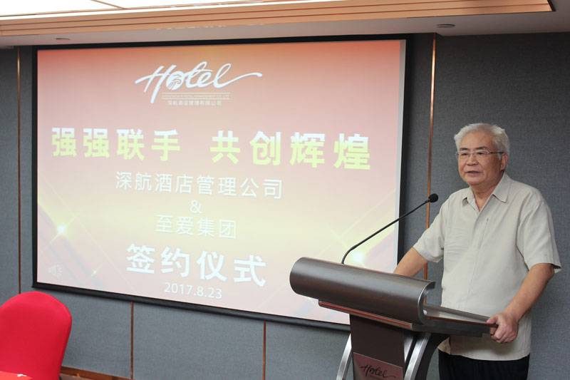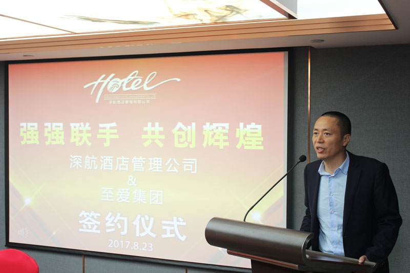 2017年8月23日, ?詈骄频旯芾砉居肷钲谥涟啪蜕钲谥涟占涔示频辏唇诿?ldquo;至爱深航鹏雅酒店”)签订全权委托管理合同, 双方将在互联网酒店新零售领域展开深度合作,并借助深航酒店管理公司的专业化管理服务, 为下榻宾客打造全新生活方式——新零售酒店(移动互联网技术与实体消费场景体验相结合的新型电商业态酒店) 。 当天, 深航酒店管理公司总经理黄俭先生、副总经理肖强先生、郭广军先生以及至爱集团董事长侯波先生、联合创始人苏星女士、股东黄丹女士和陈森先生、集团总裁张晓明女士以及特邀嘉宾深圳市饭店业协会创始会长易新南先生一同出席了本次签约仪式。